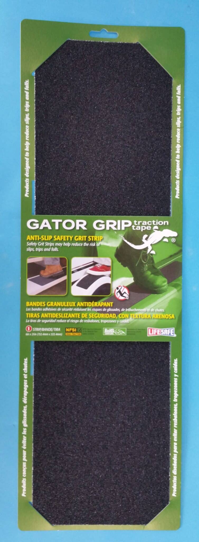 Our anti-slip safety grit tape helps provide extra traction where slippery surface conditions may occur on floors, steps and equipment. Constructed from a thick base layer with an aggressive 60-grit mineral abrasive compound. Tape is coated with an aggressive acrylic adhesive with a removable liner. Great for use in equipment rooms. Black 6″ x 21″